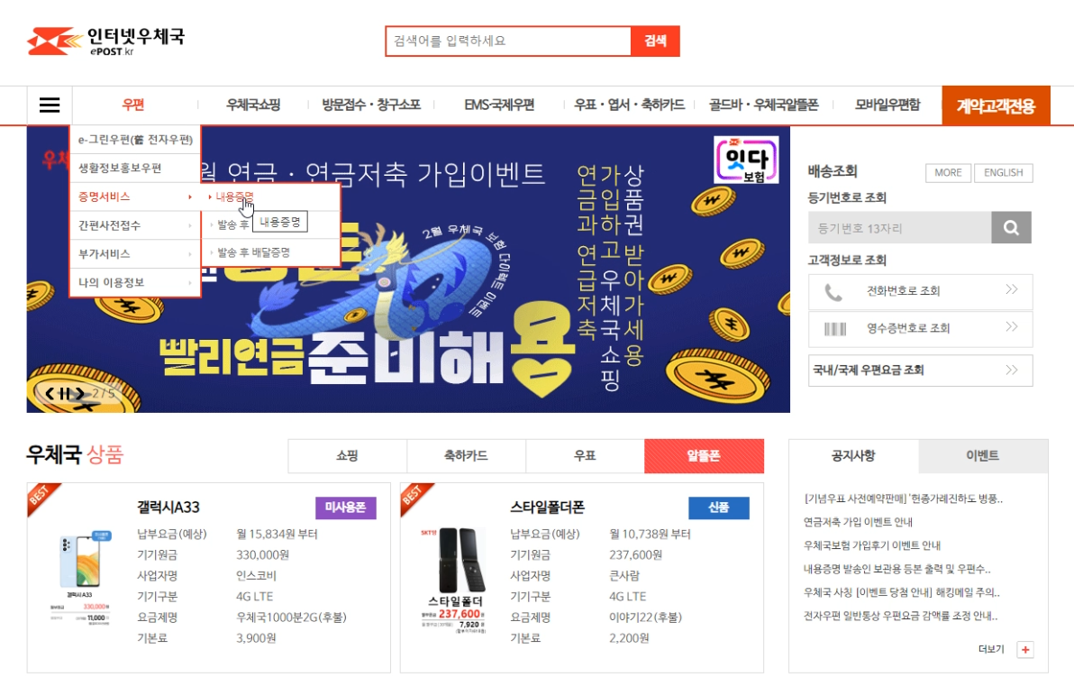 메인 화면에서 '우편' 항목에서 커서를 올려두면 하위 메뉴가 나타납니다.